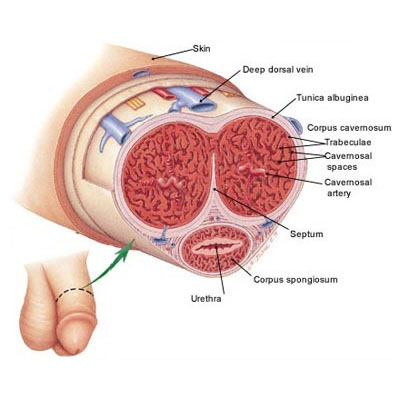 Erkek Cinsel Organı (Penis) resimde de görüldüğü üzere 3 ana kısımdan oluşur; üstte 2 adet dairesel doku yapısı (Corpora Cavernosa) ve altta daha küçük bir dairesel doku yapısından(Corpus Spongiosum) oluşur. Penis ereksiyon olduğu zaman bu dokulara kan dolmaya başlar.